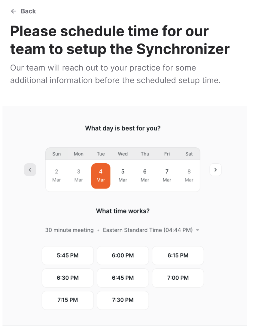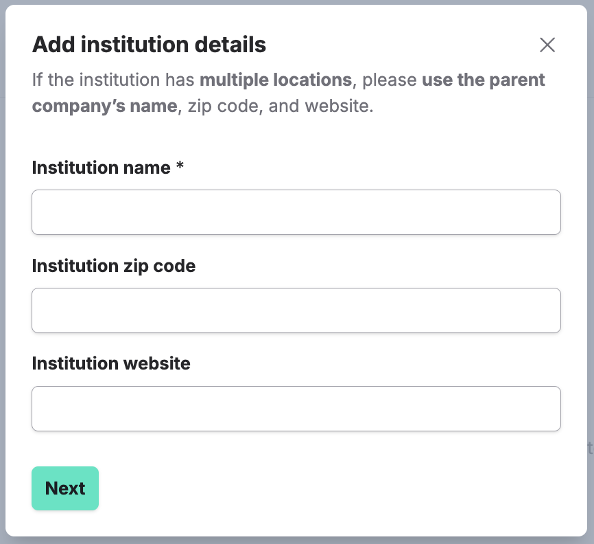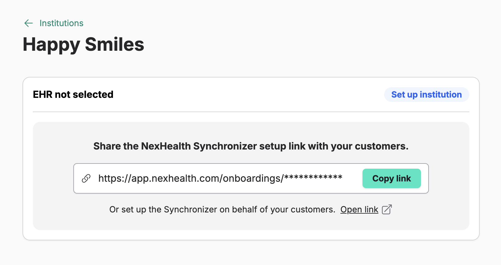 You can program your app to set up an Institution within NexHealth using the details provided to you by your customer, and receive back a Synchronizer set up link for your customer. If you (the developer) have access to this data (name, zip-code, website, office manager/IT admin's email) we recommend passing it in via the API, because it creates less steps/work for the Practice user. However, you don't need to collect these details in your app. If the you don't pass us this info, we'll just ask the practice to provide it to us.