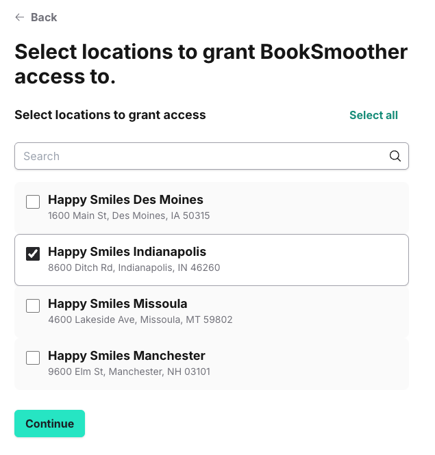 4. The practice will select which location(s) to grant access to, then click Continue.